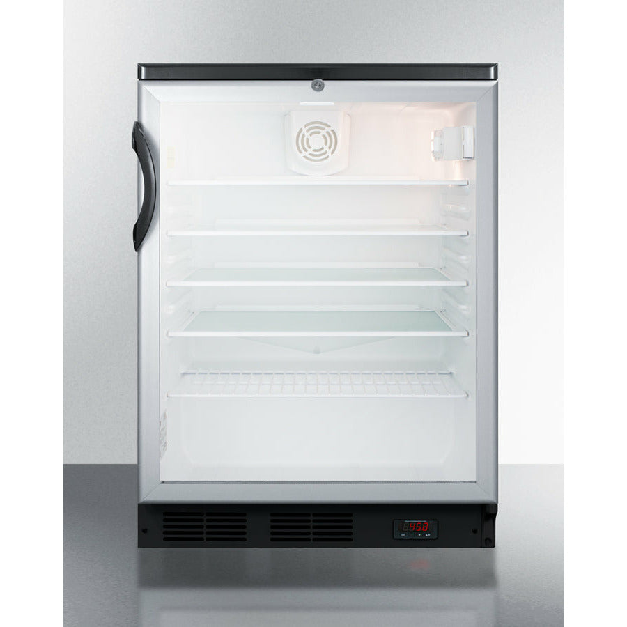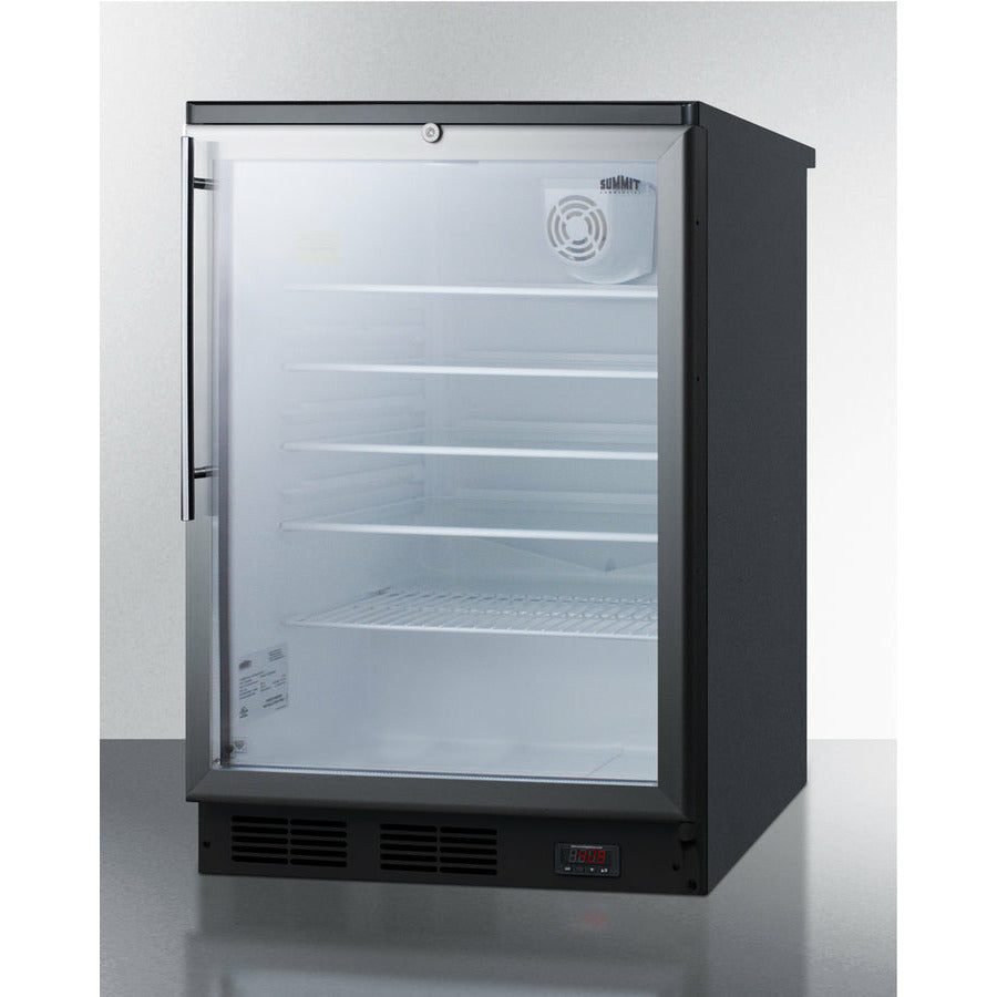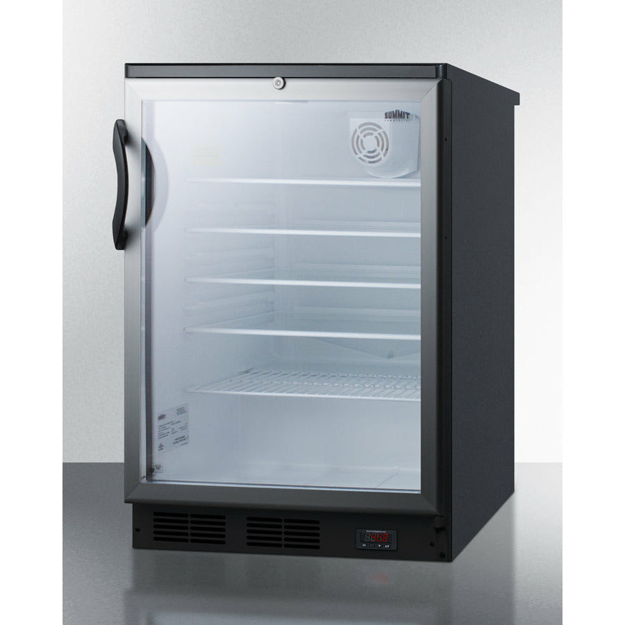 The SCR600BGLBIDTPUB is ETL-S listed to NSF-7 commercial standards. The front-breathing design allows built-in installation under counters, while the fully finished black cabinet also allows freestanding use for added flexibility. This unit includes a user-reversible double pane tempered glass door with a brushed aluminum frame. The factory installed lock offers added security and is located towards the top of the door to ensure easier access.