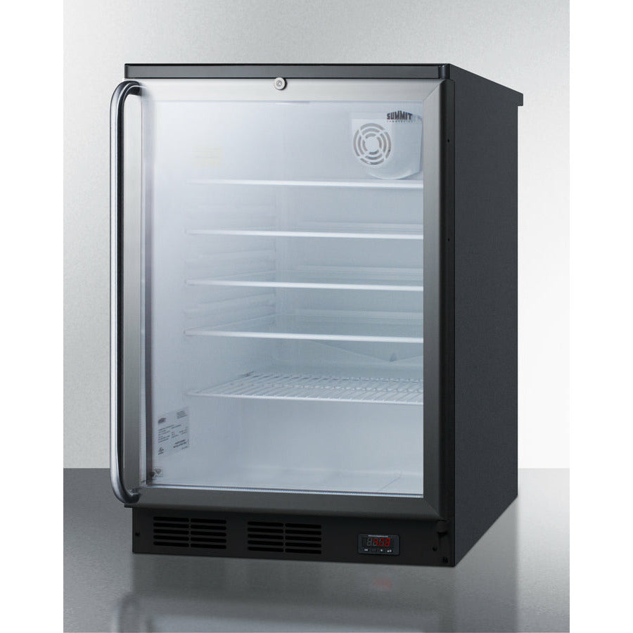 The SCR600BGLBIDTPUBSH is ETL-S listed to NSF-7 commercial standards. The front-breathing design allows built-in installation under counters, while the fully finished black cabinet also allows freestanding use for added flexibility. This unit includes a double pane tempered glass door with a brushed aluminum frame and a full-length towel bar handle in brushed stainless steel. The factory installed lock offers added security and is located towards the top of the door to ensure easier access.