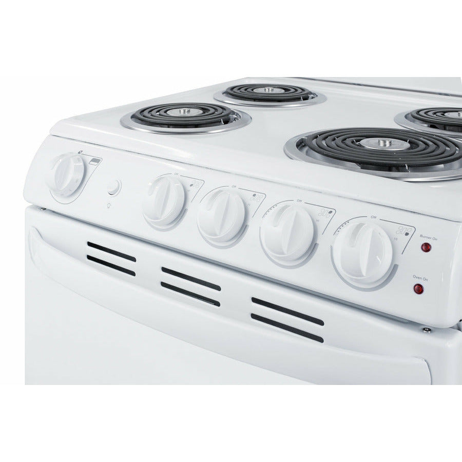 The RE203W comes in a white exterior finish with color-matched knobs and handle. With its slim fit and quality design, this unit is the ideal choice for space-challenged kitchens on a budget. For more options, including smooth-top ranges and 24" wide choices, browse our website.