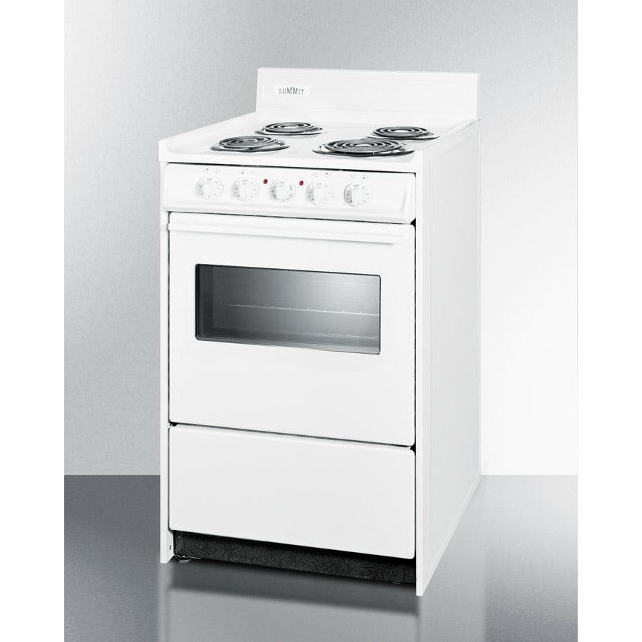 The WEM110 is an apartment-sized 220V electric range sized at just 20" wide, with a generous 2.46 cu.ft oven interior that can accommodate large trays. Two adjustable oven racks are included. The waist-high broiler is located inside the oven, allowing you to switch functions without moving contents to a separate compartment on the floor. The lower drop-down storage compartment is ideal for keeping pots and pans out of the way in small kitchens.