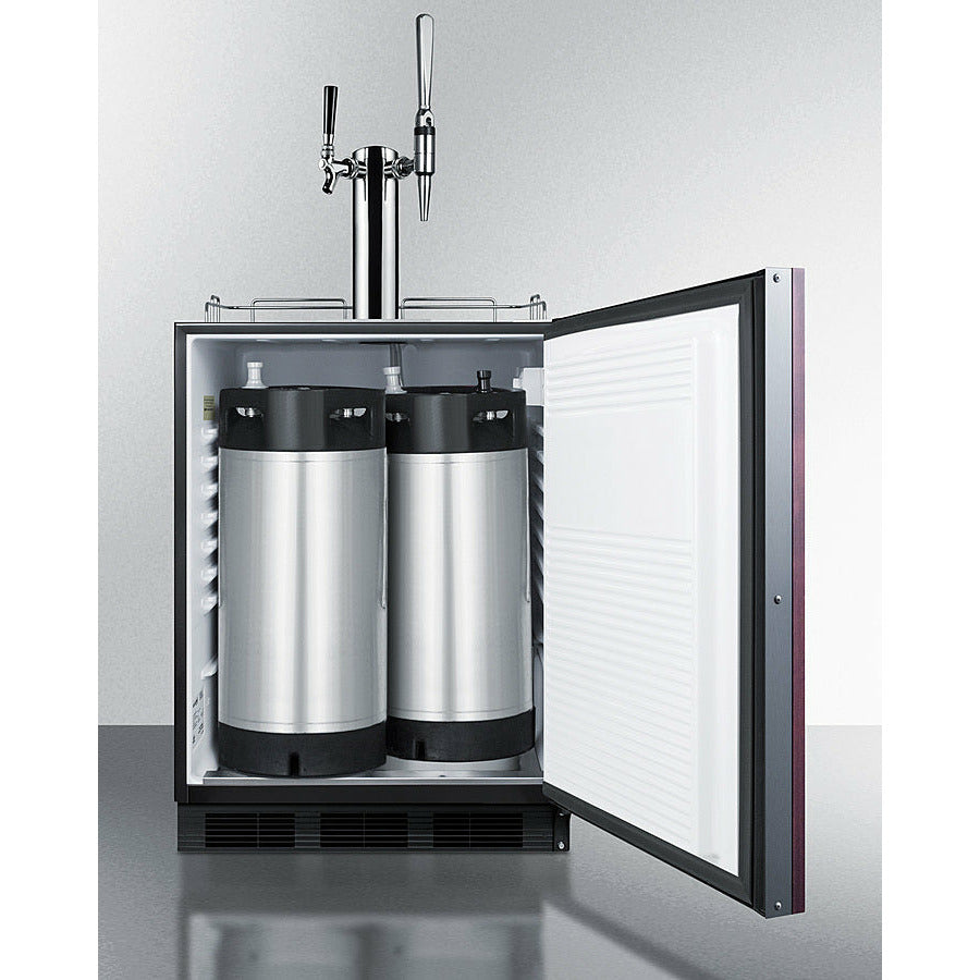 The SBC58BLBIADAIFCMTWIN is a dual tap coffee kegerator designed to serve both nitro-infused and regular cold brew coffee on tap. Sized at 32 inches high, it is designed to fit under lower ADA compliant counters. The front-breathing design allows built-in installation, while the fully finished black cabinet also enables freestanding use. This unit features an integrated stainless steel door frame designed to accept overlay panels, allowing you to create a custom look that blends into your cabinetry. We include a guard rail (ships uninstalled) and removable two-piece stainless steel drip tray for cleaner service. This unit ships with a commercial grade tap kit with a dual tower that lets you serve both standard "flat" iced coffee and nitro-infused cold brew from two cornelius style kegs. The stainless steel draft tower includes both a standard tap and stout style faucet to accommodate both styles of cold brew, as well as a regulator, nitrogen tank, and ball locks to connect to two cornelius kegs.