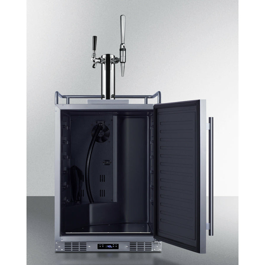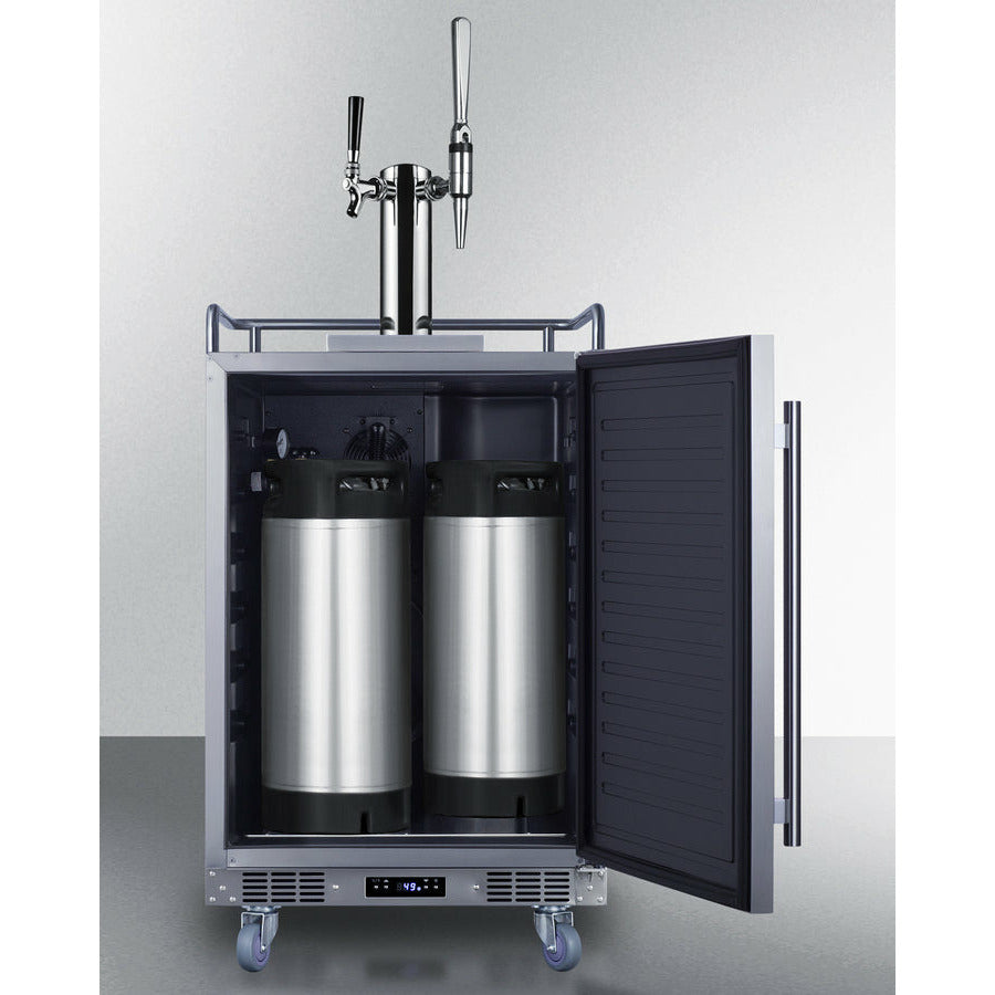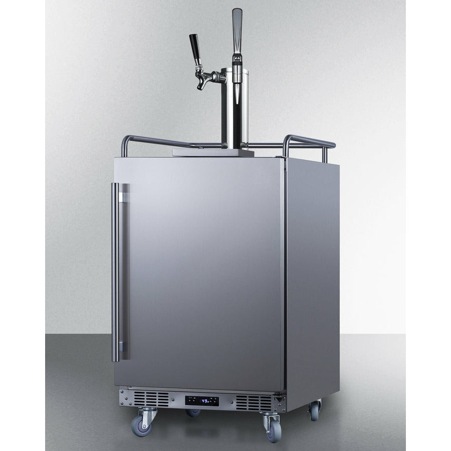 The SBC682CMTWIN is a full-sized kegerator designed to serve nitro-infused cold brew coffee on tap. It is ETL-S listed to NSF-7 standards and meets UL-471 for commercial applications but is also approved for residential use. Sized at just 24" wide, it features a weatherproof 304 grade exterior for long-lasting durability safe for use in outdoor settings. The front-breathing system allows built-in installation, while the fully finished cabinet and included caster set make for easy freestanding, portable use. This unit features a user-reversible stainless steel door with a pro style vertically mounted handle. The sealed back allows for easy cleaning of the unit. Additional features include a removable two-piece stainless steel drip tray to collect spills and a chrome guard rail to help keep glasses and mugs in place.