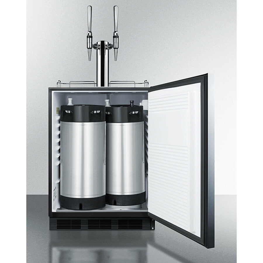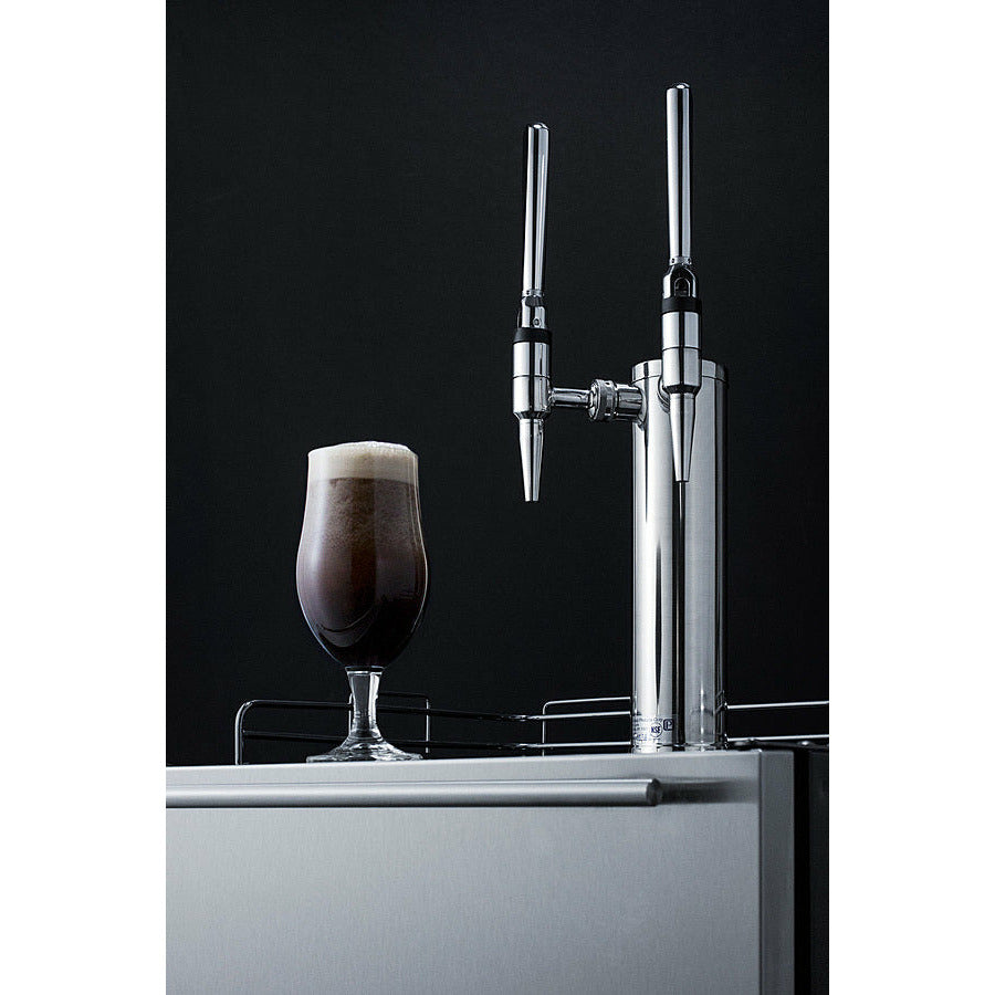 Sized at 32 inches high, the SBC58BLBIADANCFTWIN is designed to fit under lower ADA compliant counters. The front-breathing design allows built-in installation, while the fully finished black cabinet also enables freestanding use. This unit features a user-reversible 304 grade stainless steel wrapped door complete with a stainless steel handle mounted horizontally for a modern look. We include a guard rail (ships uninstalled) and removable two-piece stainless steel drip tray for cleaner service. This unit ships with an NSF-listed stainless steel tap kit that includes everything you need to serve nitro-infused cold brew coffee, including a standard dual tap draft tower, regulator, and nitrogen tank.