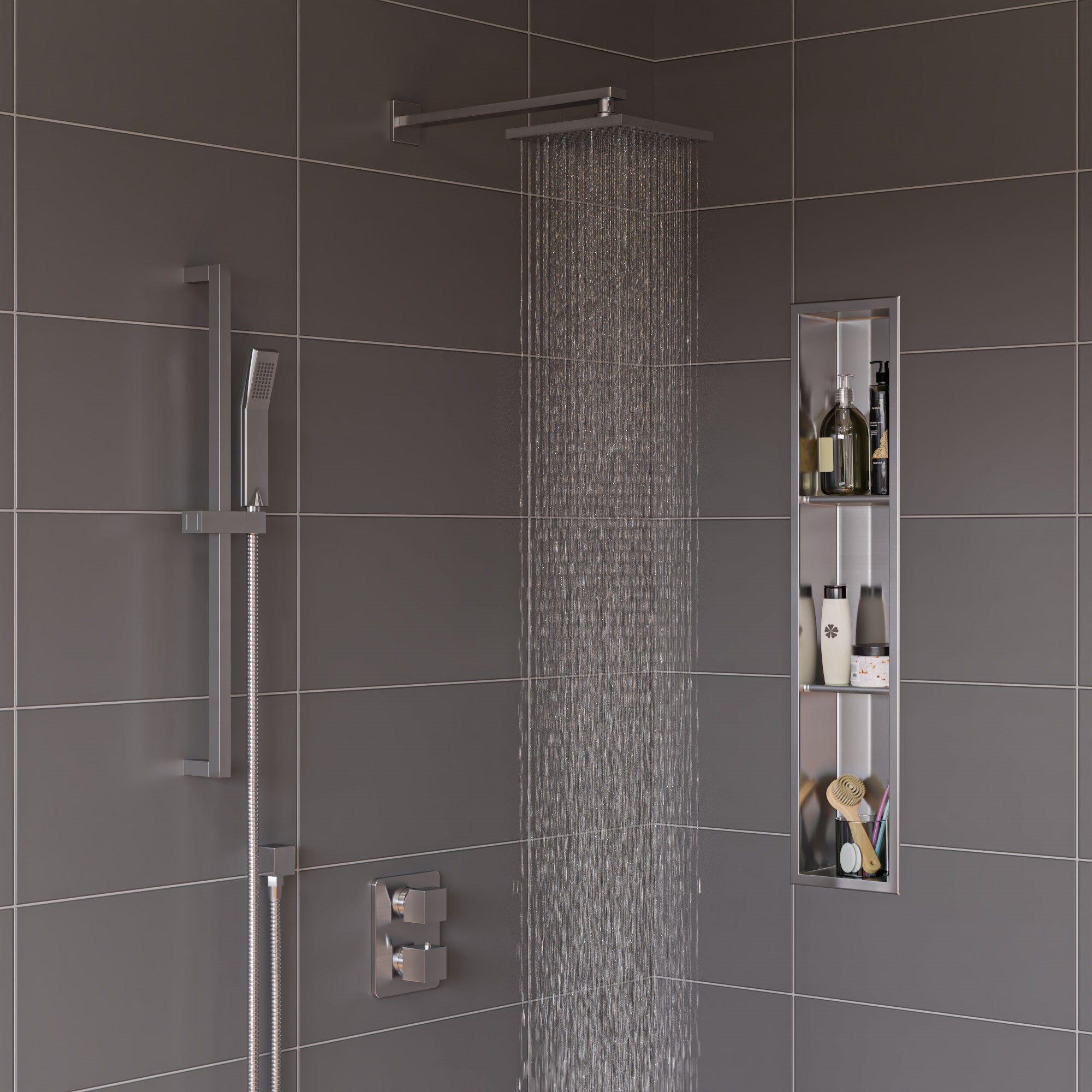 | SHORT DESCRIPTION | Everything you need for the best shower experience. This contemporary shower set by ALFI brand comes with a water diverter, temperature control, rain showerhead and handheld showerhead. All parts match and have modern squared edges. Available in two finishes to accommodate your bathroom style, polished chrome and brushed nickel. Go ahead, indulge a little. |