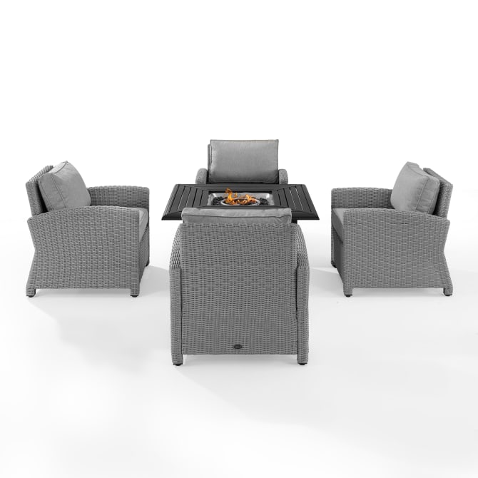 Gather around the fire for a relaxing evening with the Bradenton 5pc Conversation Set. Four all-weather resin wicker armchairs surround a powder-coated steel fire table, for cozy outdoor entertaining. Each chair features back and seat cushions covered in a solution-dyed polyester providing durability and comfort. The fire table's slatted top and solid paneled base offer a simple design that blends with a variety of outdoor spaces. The gas controls and a rack for a propane tank are located inside the table's base, keeping them close at hand but out of sight. You'll be ready to relax in comfort with the Bradenton conversation set.