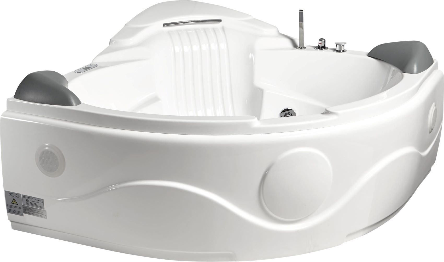 Relax and unwind in the AM505 luxurious combination air and whirlpool tub. This contemporary stand-alone corner tub complements any bathroom décor while providing a spa-like experience. Recline and stretch out as you enjoy the cascading waterfall tub, featuring 8 powerful hydro-massage jets, 8 soothing air jets, and a premium Bluetooth sound system. The digital keypad allows you to control the intensity of the jets, operate the sound system, and change the chromatherapy lighting color, creating a fully customizable and therapeutic bathing experience. Cushioned neck pillows add extra comfort for a truly indulgent soak.