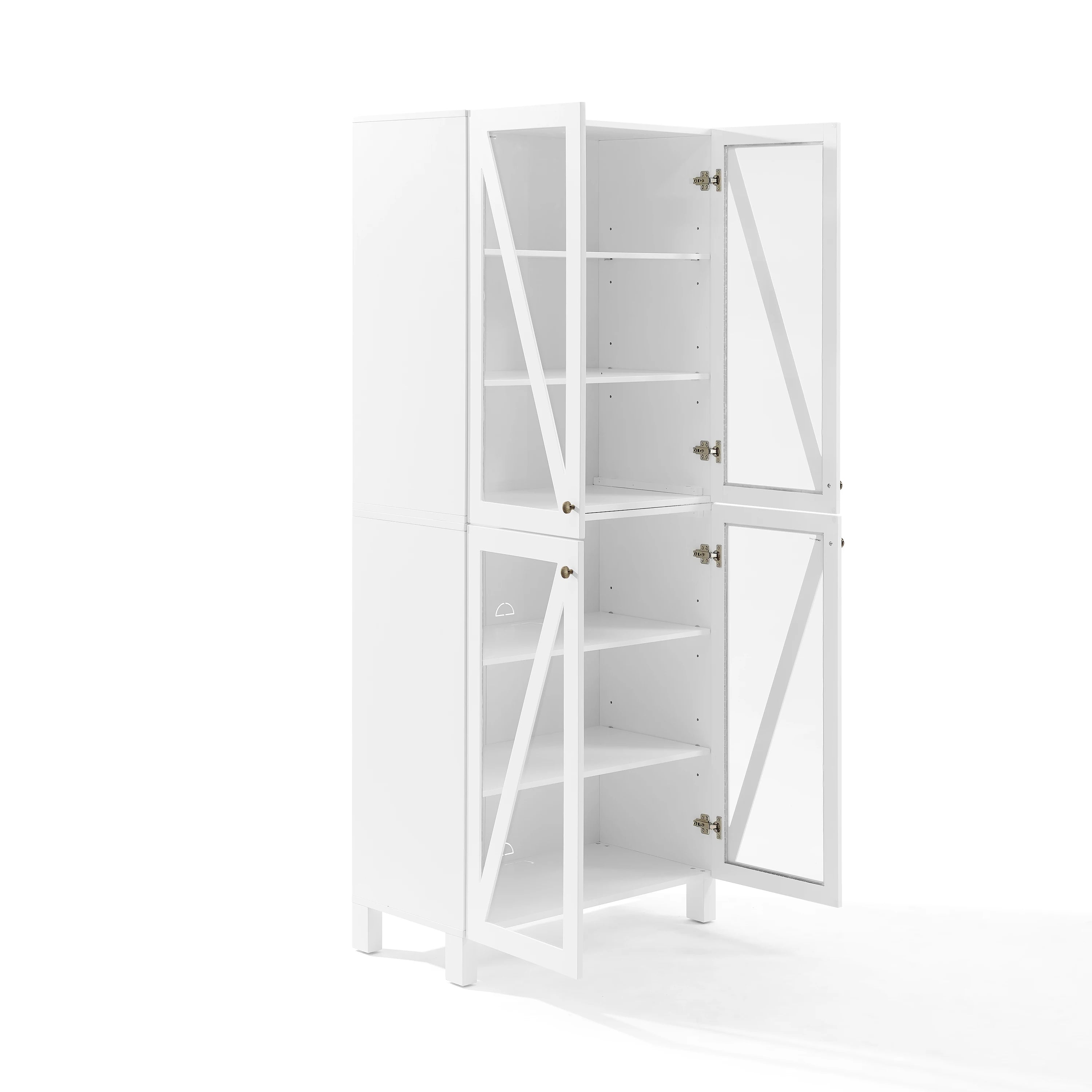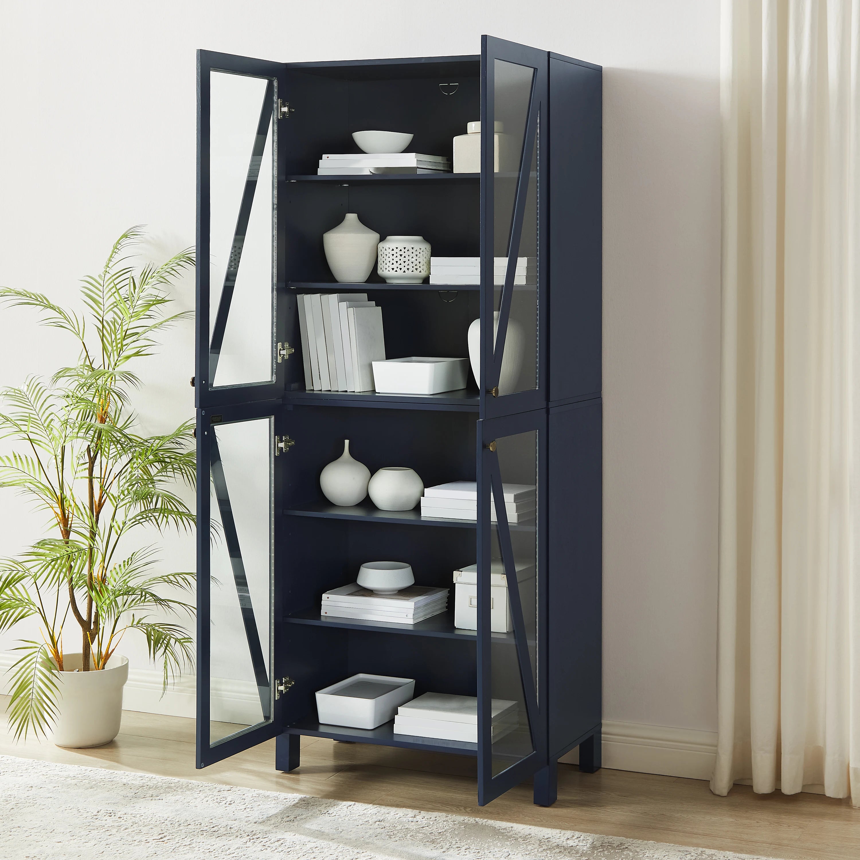 The Cassai Tall Pantry combines modern farmhouse design with practical storage. Made of two stackable pantry cabinets, it features tempered glass doors with X-shaped wood accents and four adjustable shelves. Versatile and modular, this tall storage cabinet works beautifully in the kitchen, laundry room, living room, or bathroom.