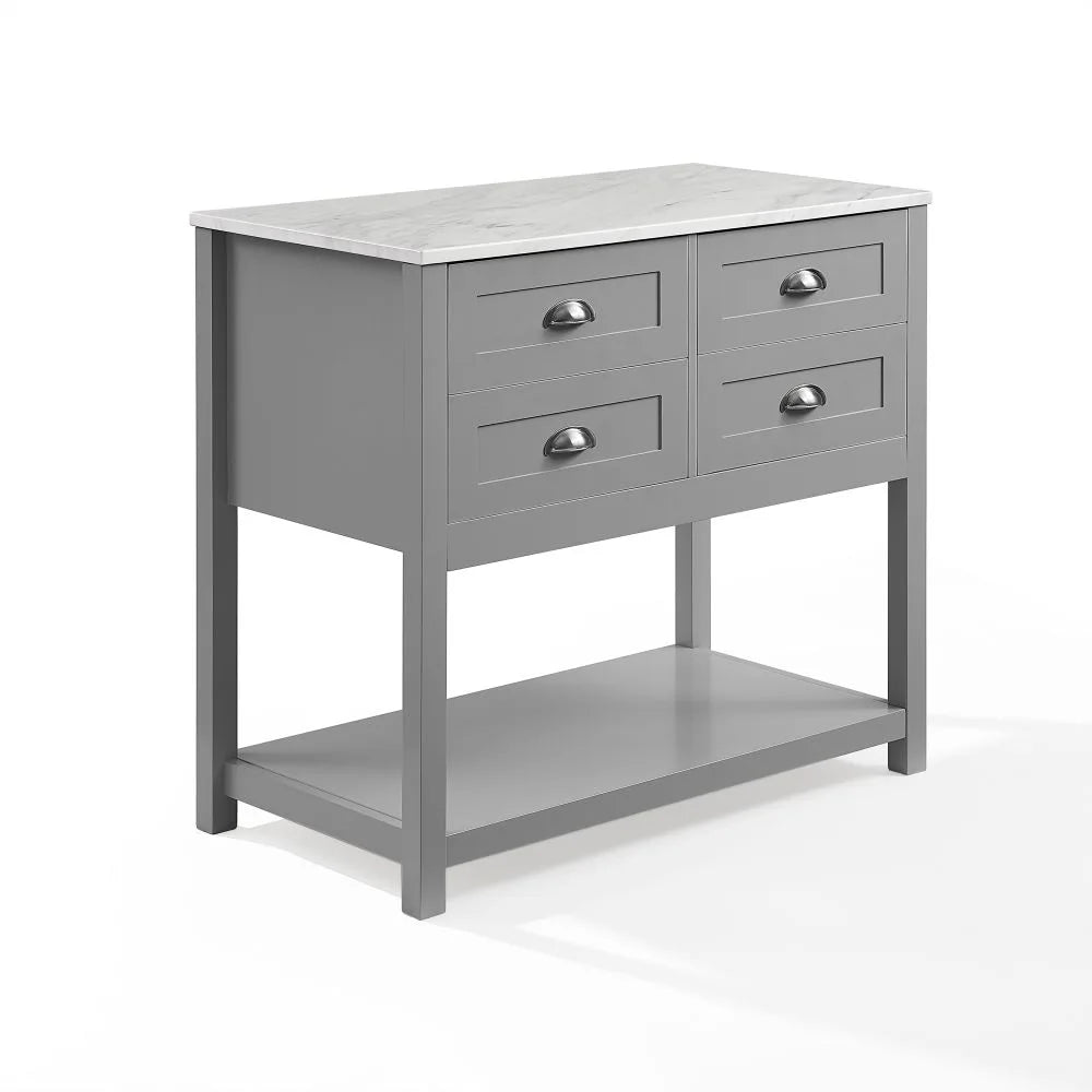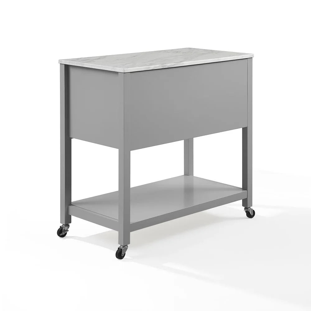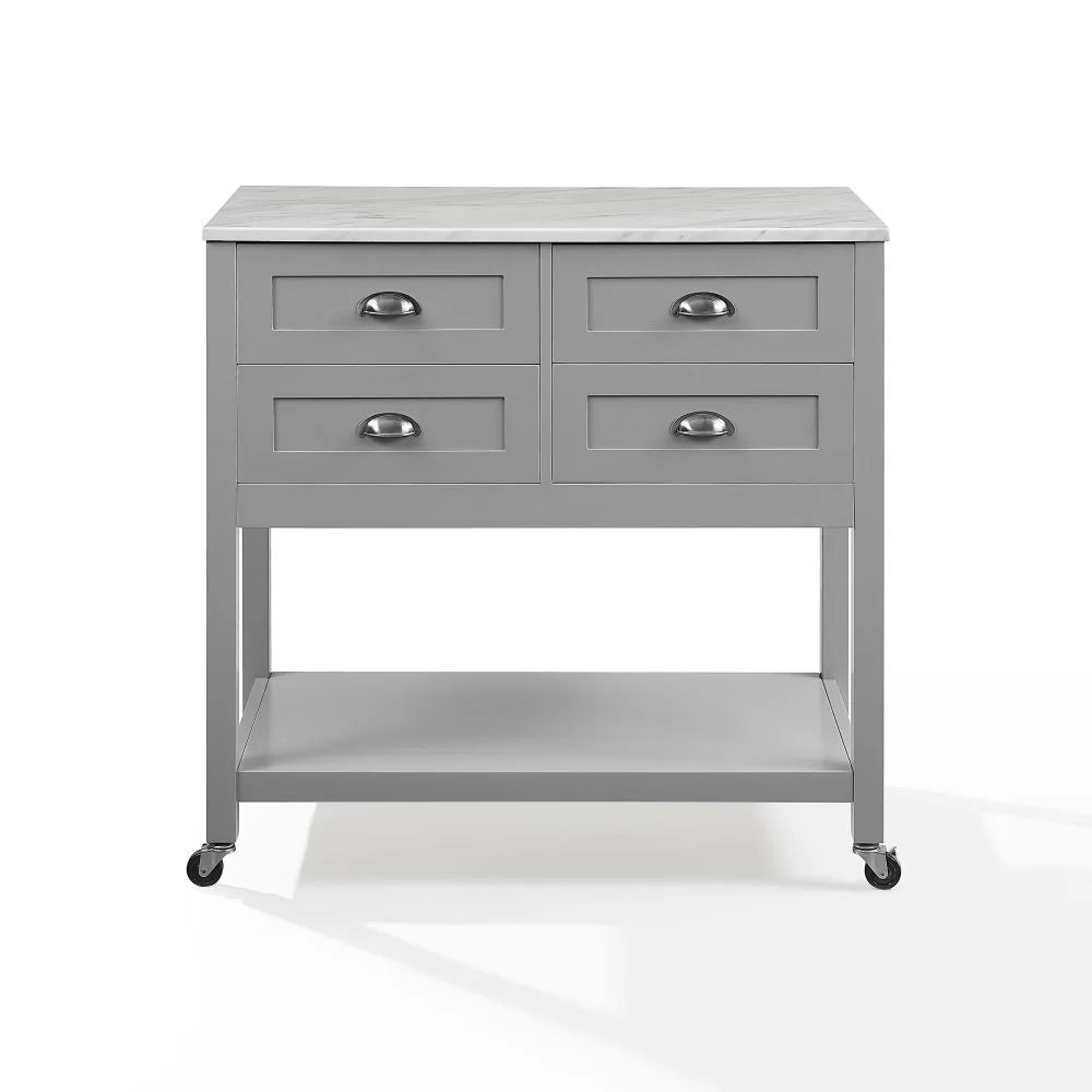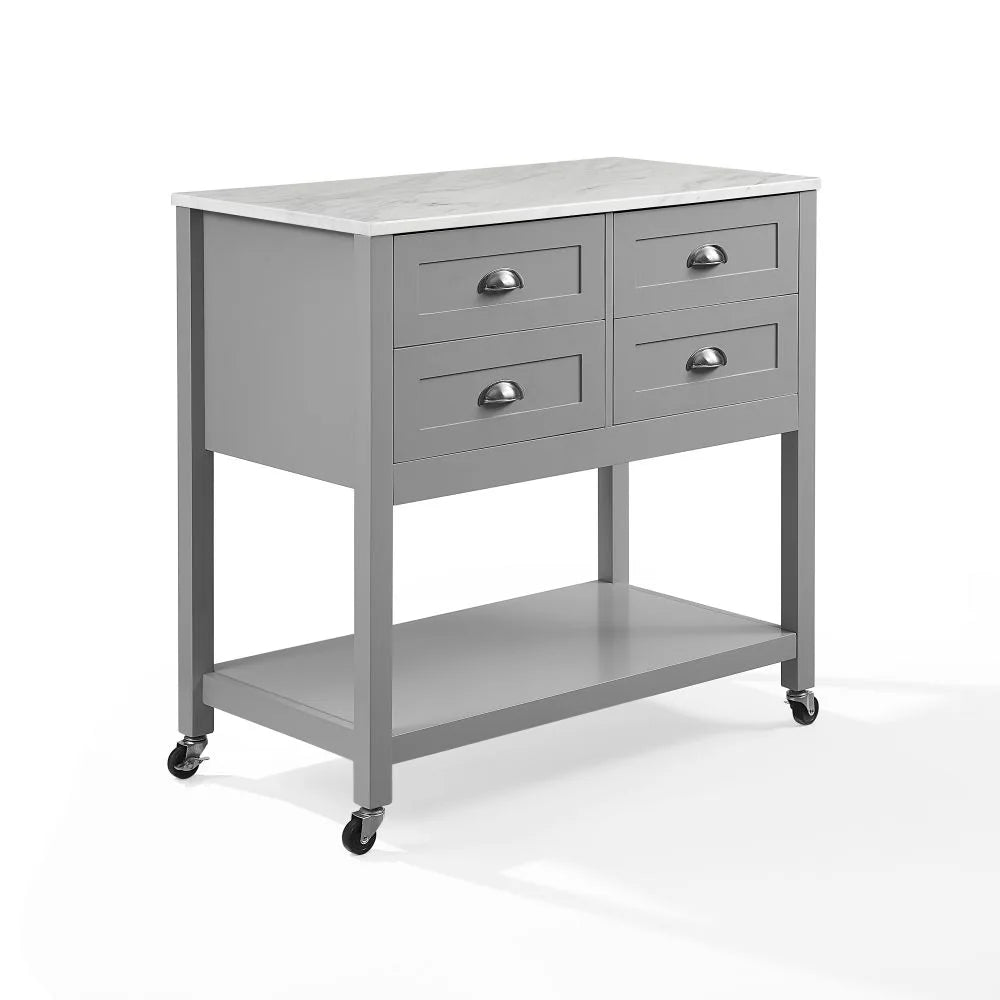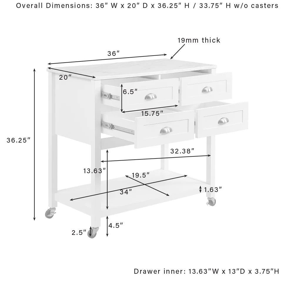 Elevate any kitchen with the high-end look of the Connell Kitchen Island/Cart. Featuring a faux marble countertop, four full-extension drawers, and an open stationary shelf, this versatile island adds storage and style. With optional casters, it can be used as a stationary island or a mobile cart, perfect for food prep, a coffee bar, or a microwave stand.