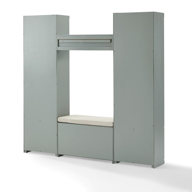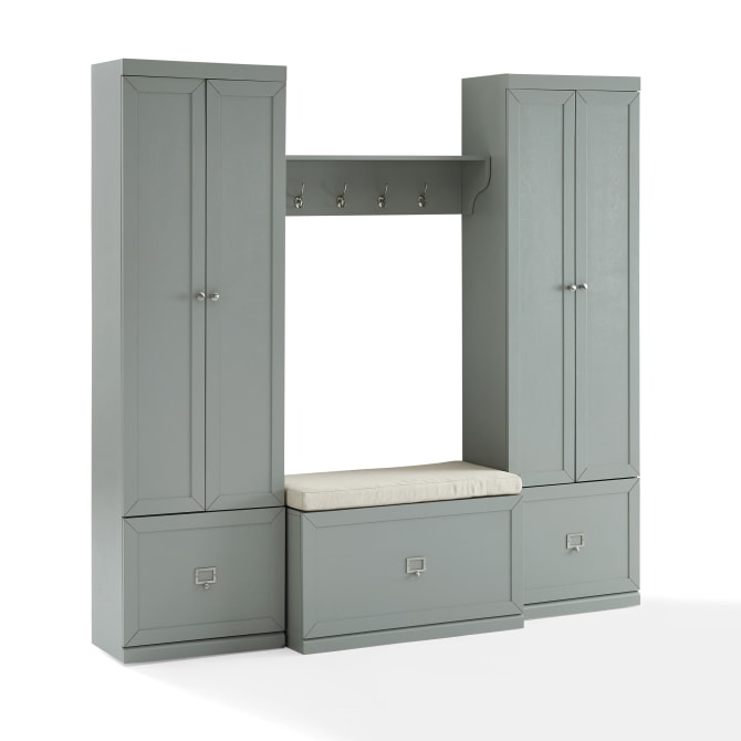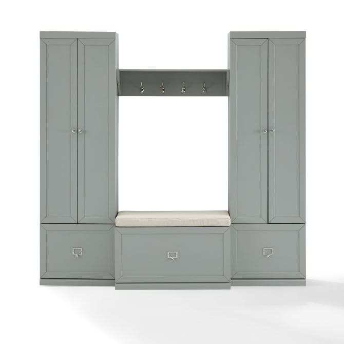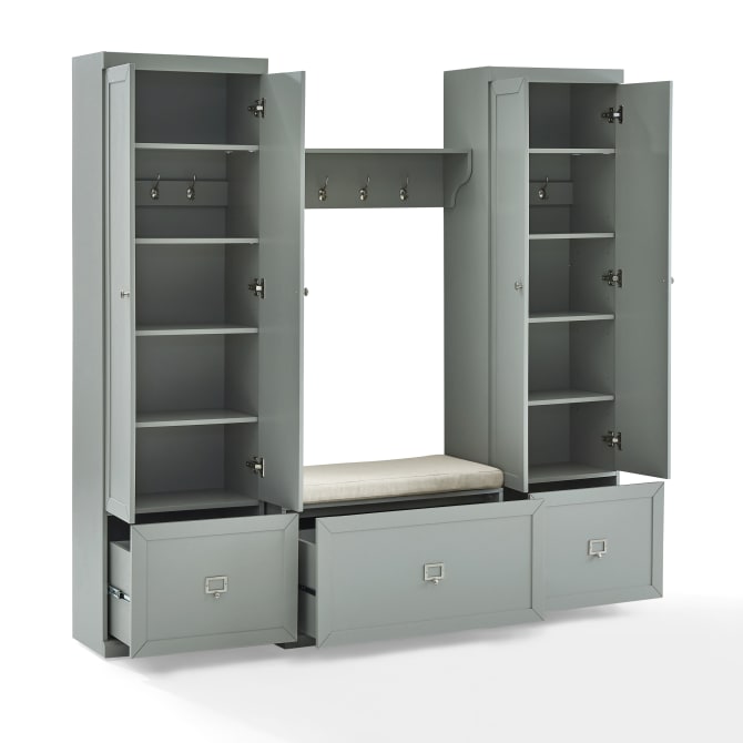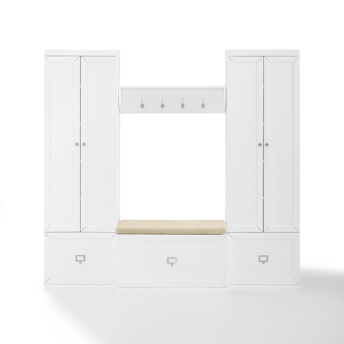 The Harper 4pc Entryway Set offers a great combination of storage solutions for your foyer or mudroom. Pantry closets provide adjustable and removable shelves, plus full-extension drawers. Without the shelves, the pantry closets offer hanging storage when you install the optional hooks. Tucked between the pantry closets is an entryway bench with a cushioned seat and a wall-mounted shelf. Featuring label holder hardware, each storage drawer can be customized with personal labels. Every component of the Harper 4Pc Entryway Set is modular, allowing for flexibility and the look of genuine built-in storage.