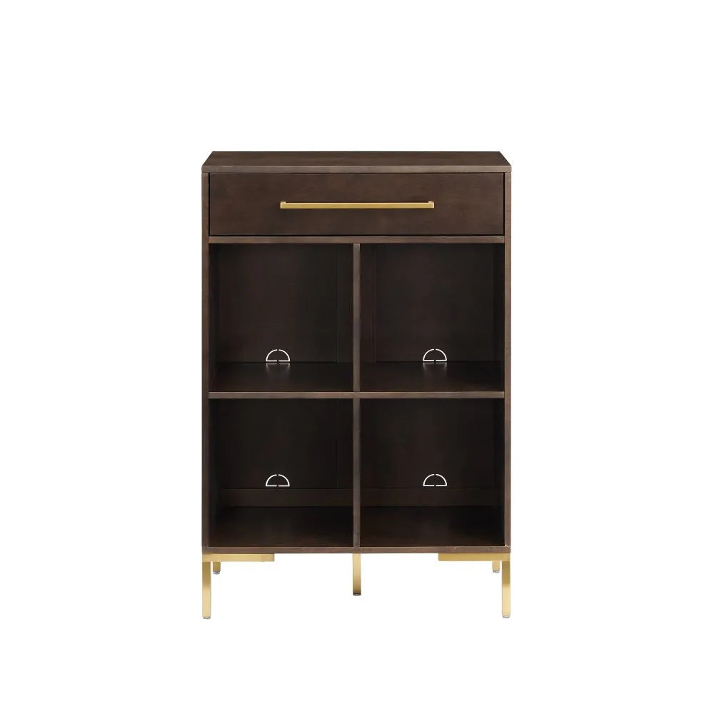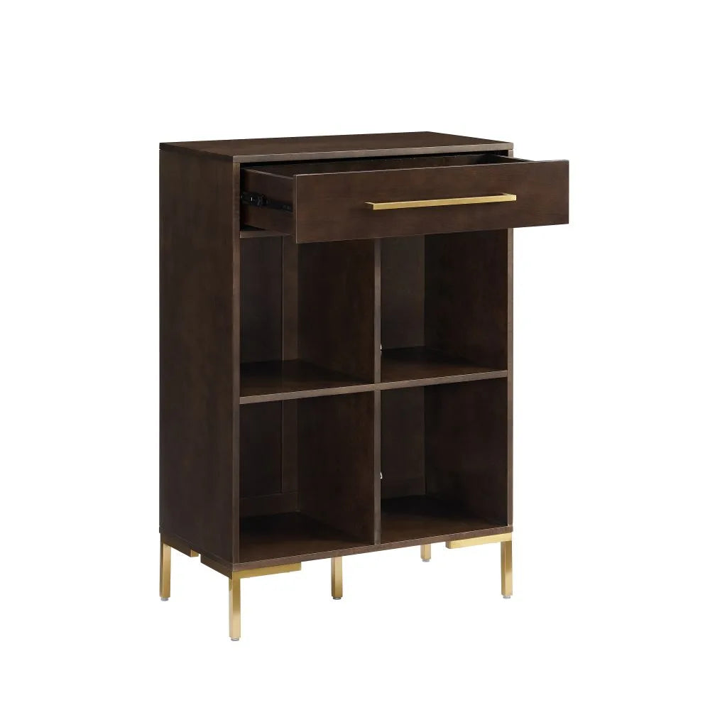Incorporate streamlined modern storage into your home with the Juno Record Storage Cube Bookcase. Featuring a sleek silhouette and stylish brass hardware, this cube organizer includes four shelves sized perfectly for standard vinyl records, books, or décor. A full-extension drawer provides space for accessories, while the top accommodates most record players. With cable management and modular expandability, the Juno is a must-have for vinyl lovers and modern home organization.