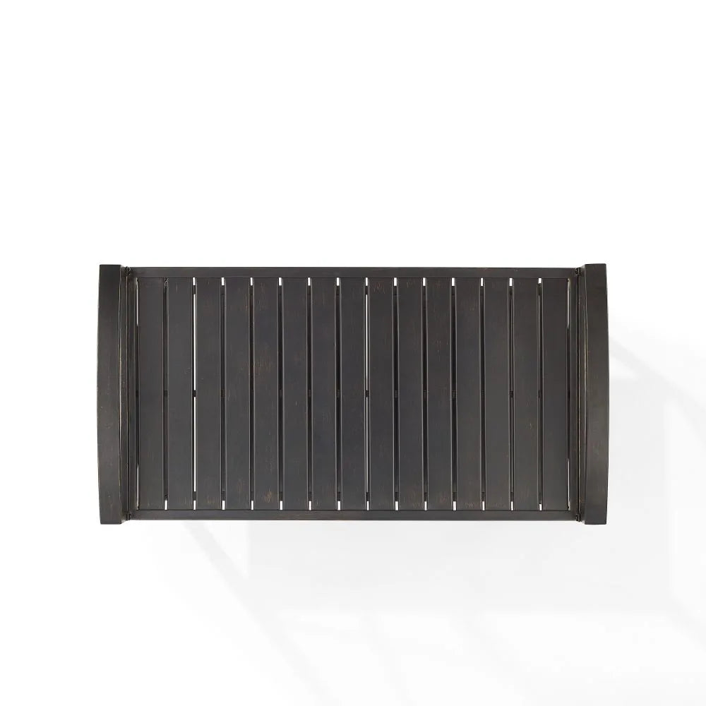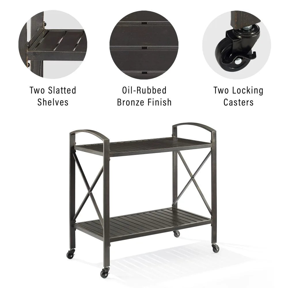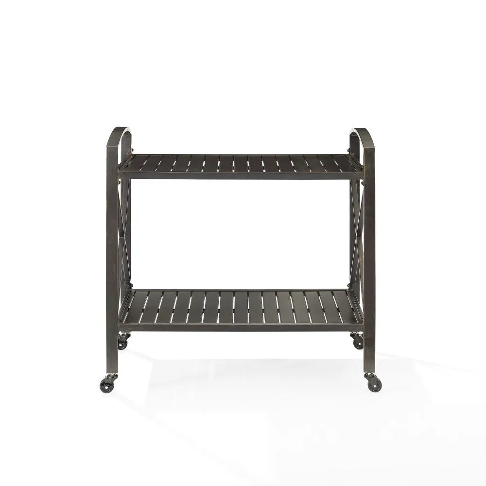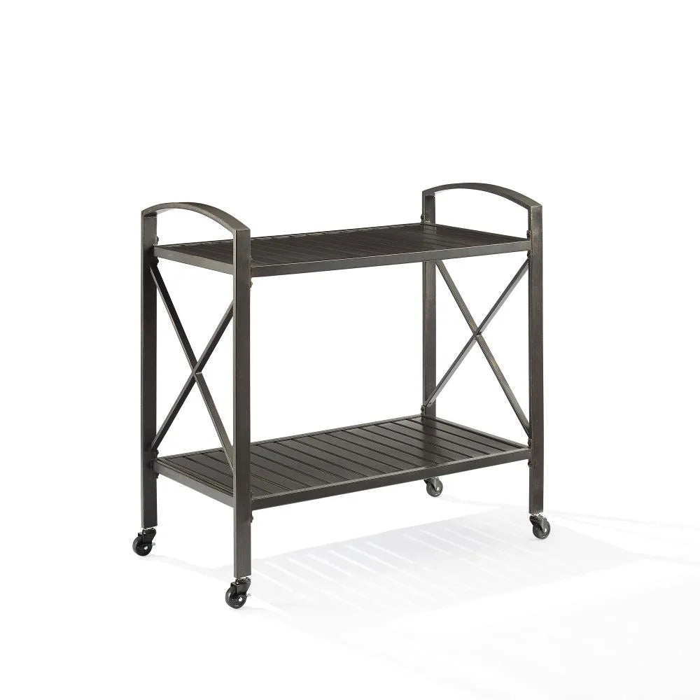 Crafted from all-weather powder-coated steel, the Kaplan Outdoor Bar Cart makes entertaining outdoors effortless. With two sturdy slatted shelves and a classic X-design on the sides, this mobile bar cart offers both style and function. Four caster wheels, including two with locks, let you easily move drinks, food, and dishware to wherever the party happens. Designed with durability in mind, the oil-rubbed bronze finish ensures it blends seamlessly with your existing patio furniture.