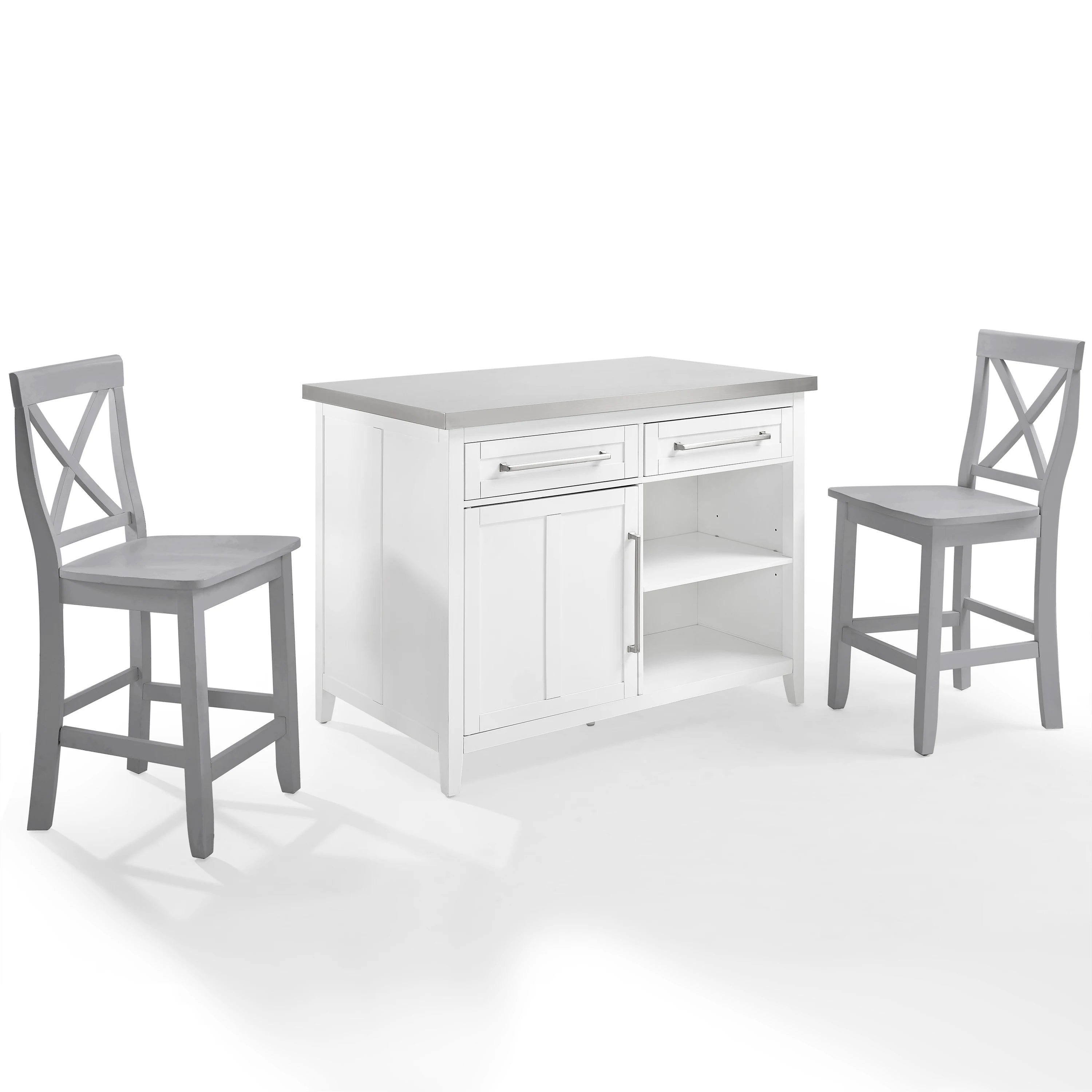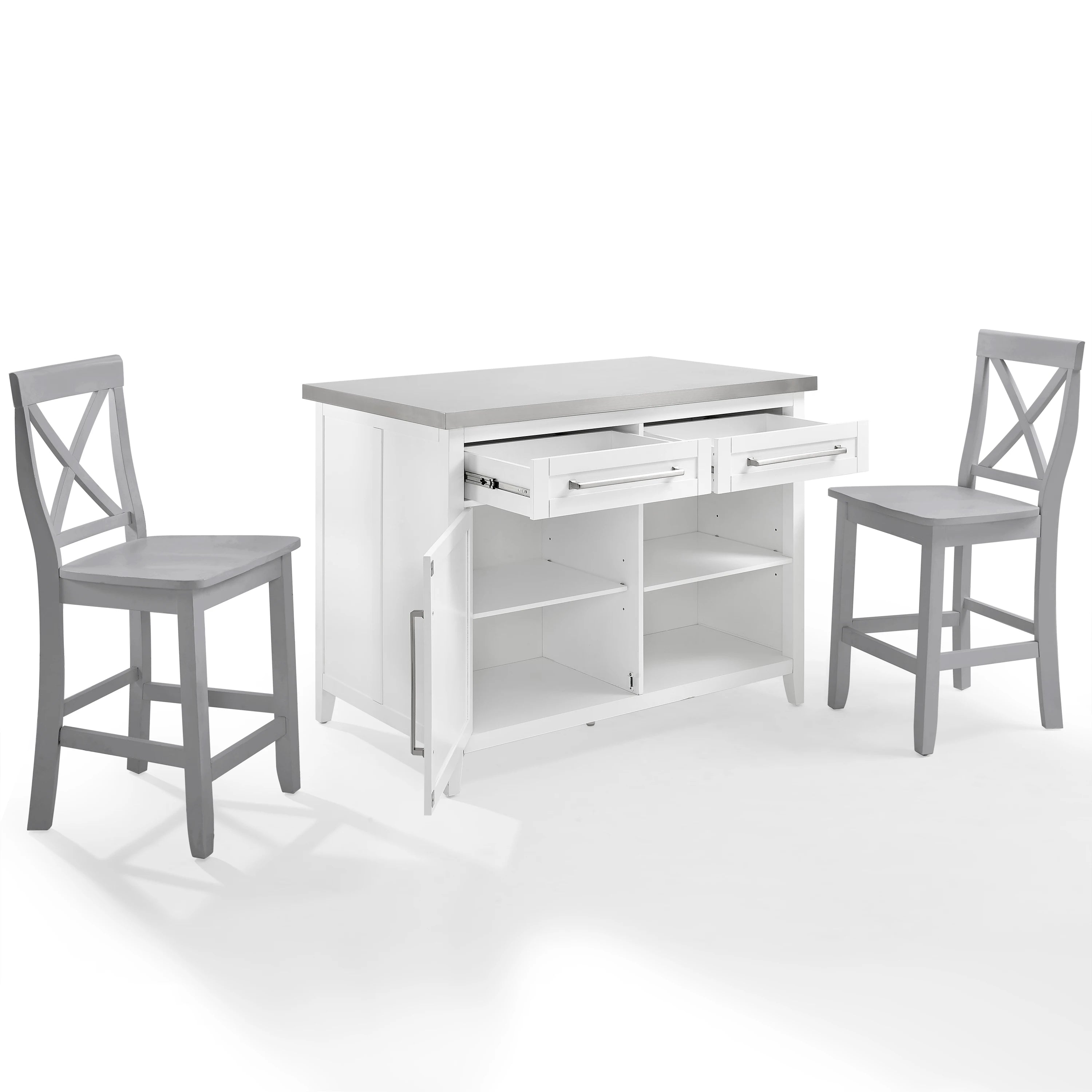 The Silvia Kitchen Island with X-Back Stools combines storage, workspace, and dining in one elegant package. With full-extension drawers, a spacious cabinet, and open shelving, this multifunctional island keeps your kitchen organized. The oversized stainless steel countertop extends for casual dining with the included x-back counter stools, making it a beautiful and practical centerpiece for your home.