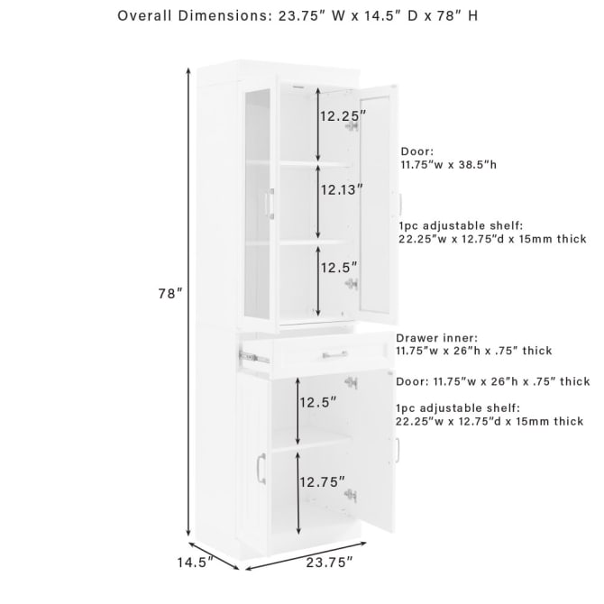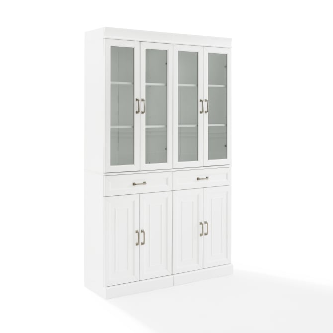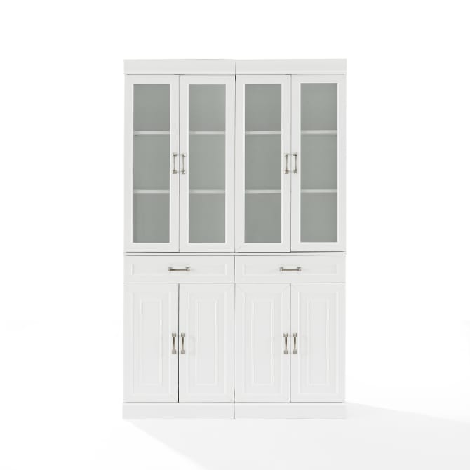 Create the look of a classic built-in china cabinet and buffet with the Stanton 2pc Glass Door Pantry Set. Each tall pantry features upper cabinets with tempered glass doors for displaying your best dishware or keepsakes, plus adjustable shelving for flexibility. The lower cabinets of each pantry also offer adjustable shelving that is concealed by panel doors. Both pantries have a full-extension storage drawer for smaller items. Keep any room in your home organized with the Stanton 2pc Glass Door Pantry Set.
