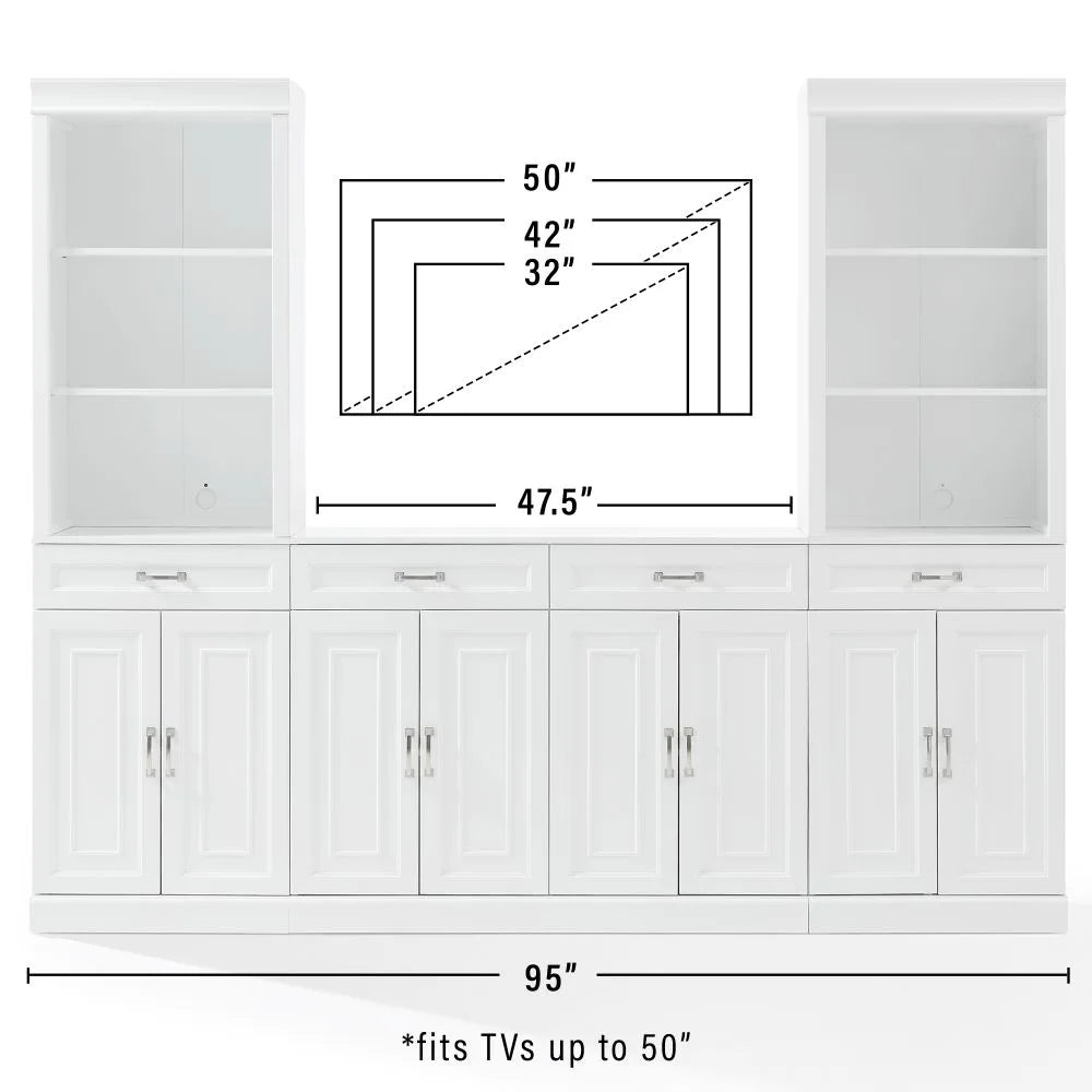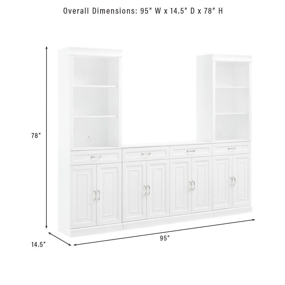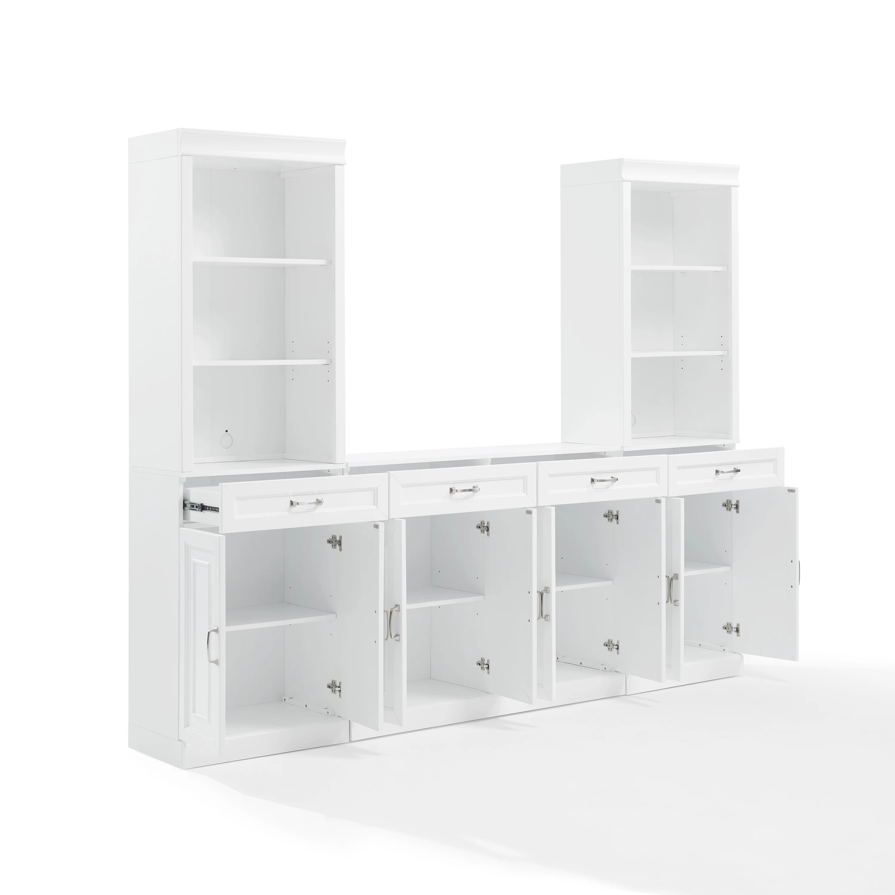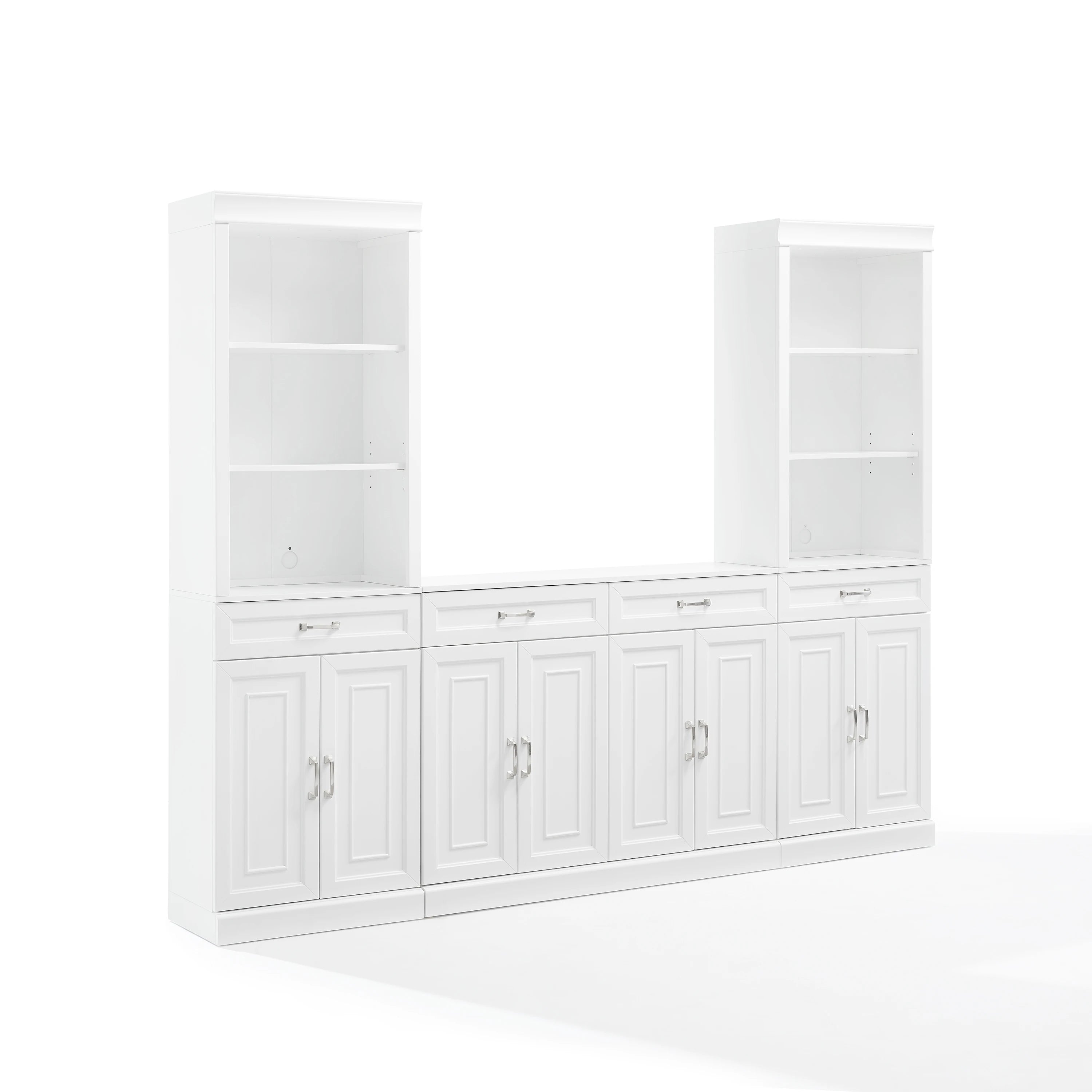 Amazingly versatile with ample storage space, the Stanton 3pc Sideboard and Bookcase Set delivers the timeless look of built-in cabinetry with a modular design. Featuring large cabinets, open bookshelves, and full-extension drawers, this set is ideal for a living room, dining room, or home office. Whether styled as a buffet, entertainment center, or library wall, Stanton provides stylish organization with classic recessed-paneling and brushed nickel hardware.