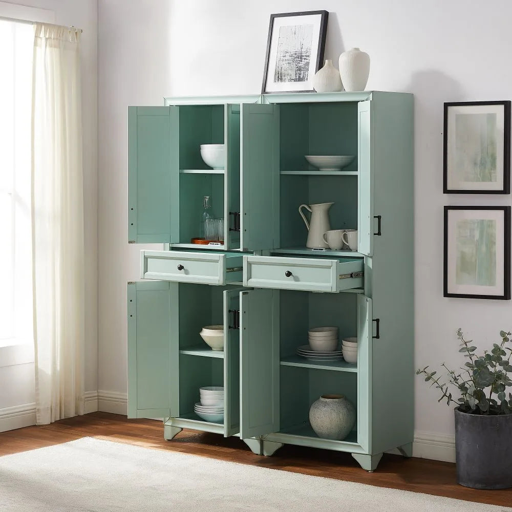 Simply charming and no longer solely a kitchen item, the Tara 2pc Pantry Set will add traditional elegance to any room without sacrificing functionality. While the adjustable shelving in the cabinets is ideal for kitchenware or cleaning supplies, they also make a great place to store extra blankets, books, and board games. The cabinets also feature beautiful metal hardware, as do the large full-extension storage drawers on ball-bearing glides. Placed at the center of the pantries, the storage drawers can be great catch-alls for odds and ends, making the Tara 2pc Pantry Set a perfect go-to for home organization.