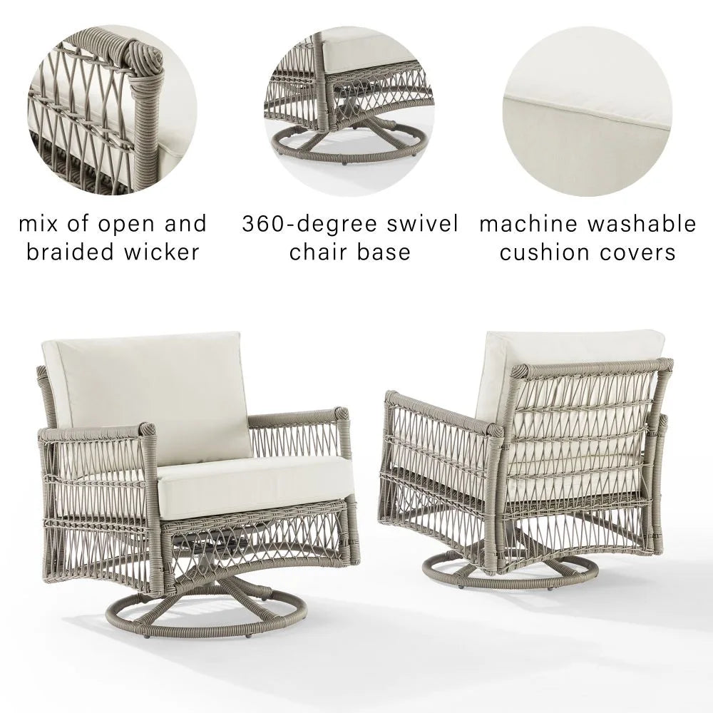 Create the look of an island retreat with the Thatcher 2pc Outdoor Rocking Chair Set. Featuring sturdy steel frames wrapped in beautiful resin wicker, these patio chairs have a high-quality swivel and rocking base for smooth, easy motion. With deep seating and thick, weather-resistant cushions, this set delivers comfort and style. The simple silhouette blends with a variety of designs, while the mix of open and braided wicker adds a unique touch to any outdoor space.