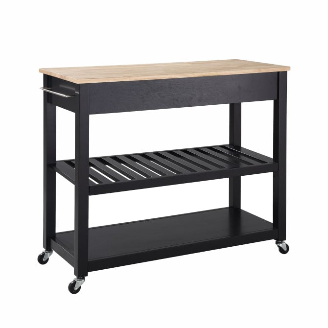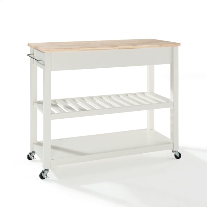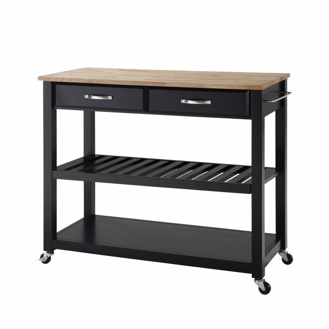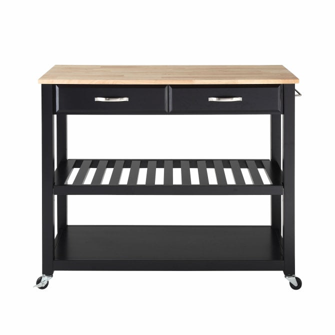 Mobility and open storage are the hallmarks of the Kitchen Prep Cart. Featuring a sturdy wood countertop and two deep storage drawers, this cart keeps utensils close at hand while providing ample space for food prep. The slatted center shelf provides storage for wine bottles and can be removed to create space for larger kitchen items. With four casters, this cart can adapt to the changing needs of your kitchen. Simple and stylish, the Kitchen Prep Cart is an ideal solution for your every day kitchen needs.