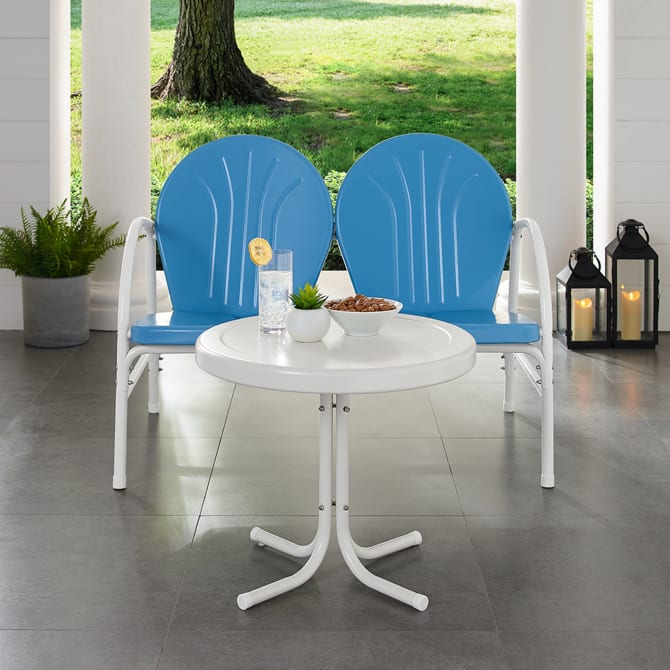 Relax with a friend on the nostalgically inspired Griffith 2pc Conversation Set. Designed to withstand the hottest summer days, this seating set's steel construction and powder-coated finish resist rust and sun fade. Featuring a vintage style that comes in a variety of vibrant colors, the loveseat adds a splash of retro fun to your porch or balcony. Add in the convenience of the pedestal side table and the Griffith conversation set is the perfect spot to enjoy a beverage at the end of the day.