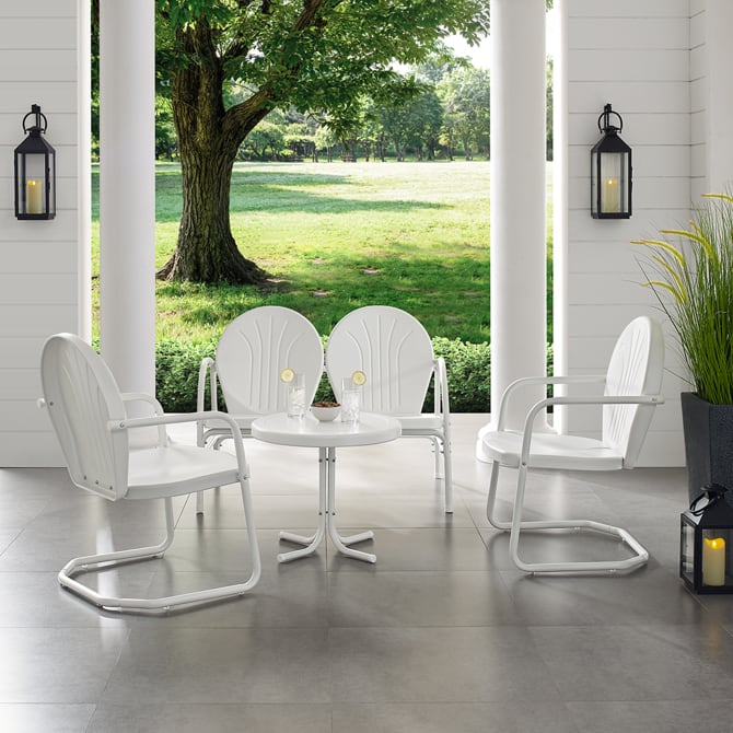 Relax and unwind on the nostalgically inspired Griffith 4pc Conversation Set. Designed to withstand the hottest summer days, this seating set's steel construction and powder-coated finish resist rust and sun fade. Featuring a vintage style that comes in a variety of vibrant colors, the loveseat and chairs add a splash of retro fun to your porch or patio. Add in the convenience of the pedestal side table and the Griffith conversation set is ready to host your next outdoor event.