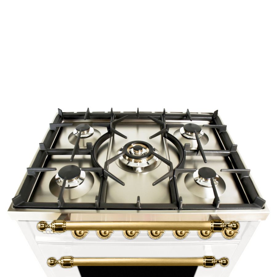 HALLMAN Professional Ranges marry elegant design with impeccable cooking performance. The five sealed Italian brass burners provide a perfect blend of power and precision, with infinite heat setting capability ranging from a searing 15,500 BTU, down to simmering 1260 BTU. Heavy-duty cast-iron grates provide a single continuous cooking surface, making it easy and safe to maneuver cookware from one burner to another.