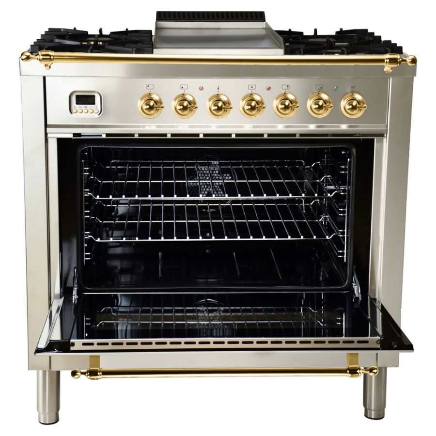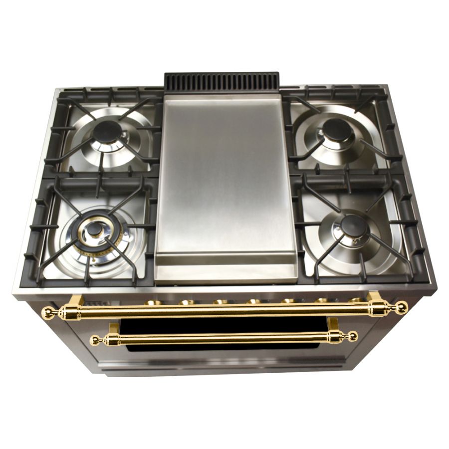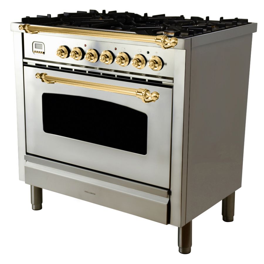 HALLMAN Professional Ranges marry elegant design with impeccable cooking performance. The sealed Italian brass burners provide a perfect blend of power and precision, with output ranging from 15,500 BTU, down to 1260 BTU. The removable stainless steel griddle features an oversized brass oval burner with 10,500 BTU. A grate is also provided to place over the oval burner, creating flexible functionality. Heavy-duty cast-iron grates provide a single continuous cooking surface, making it easy and safe to maneuver cookware from one burner to another.
