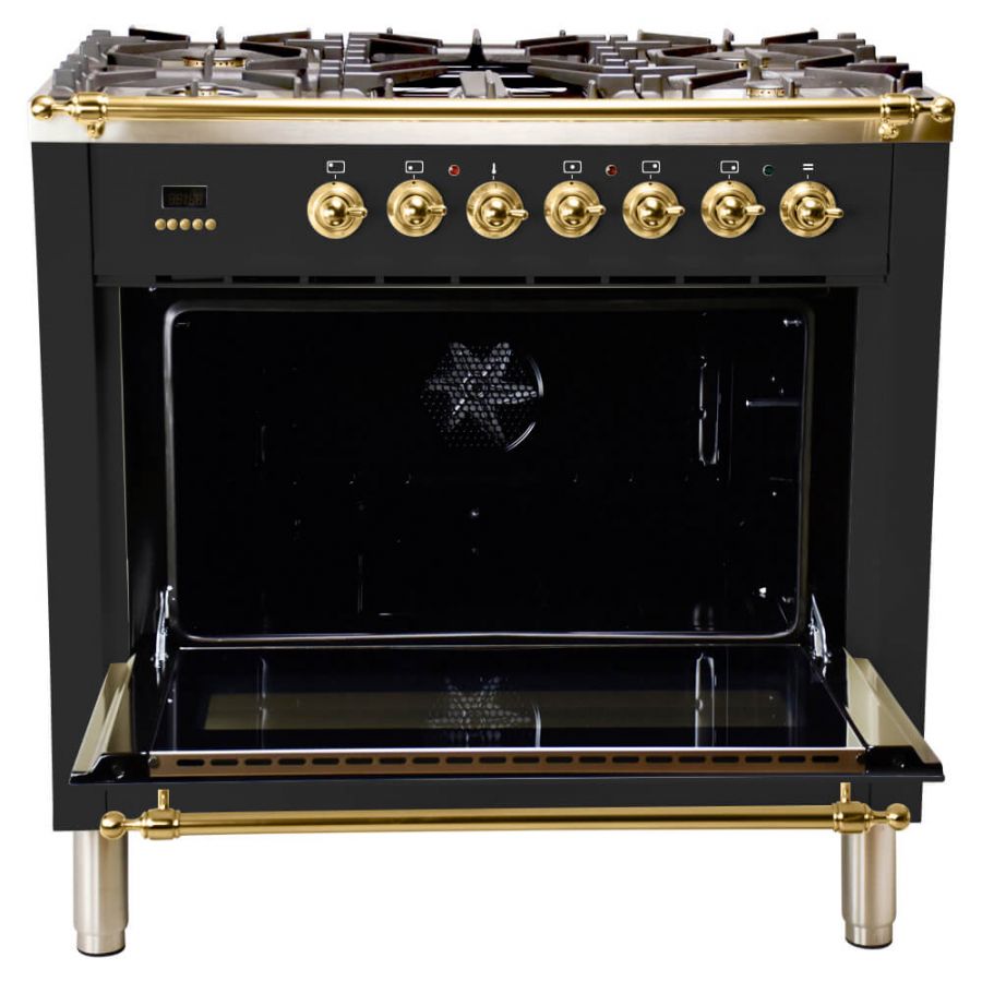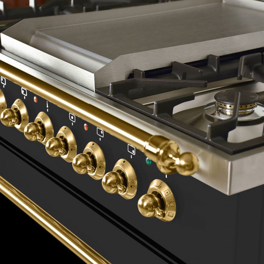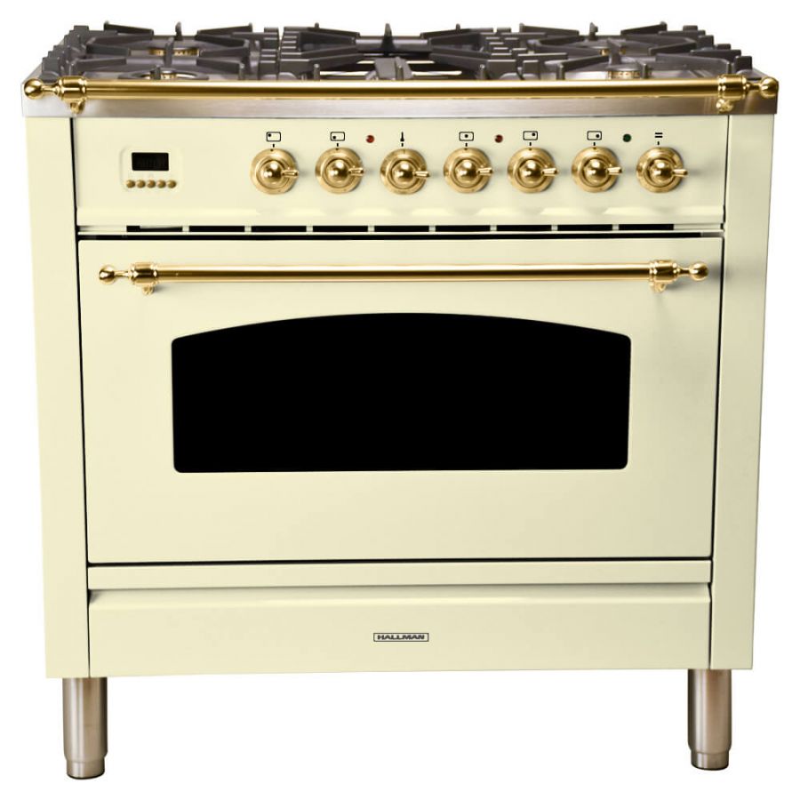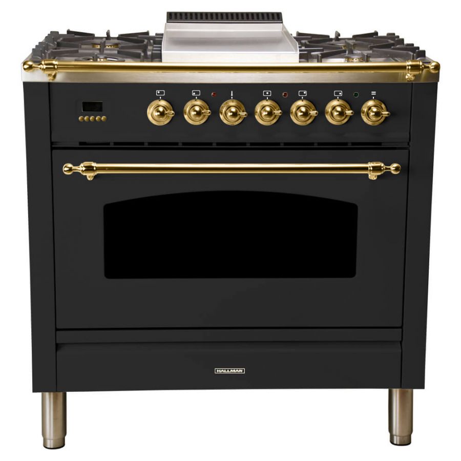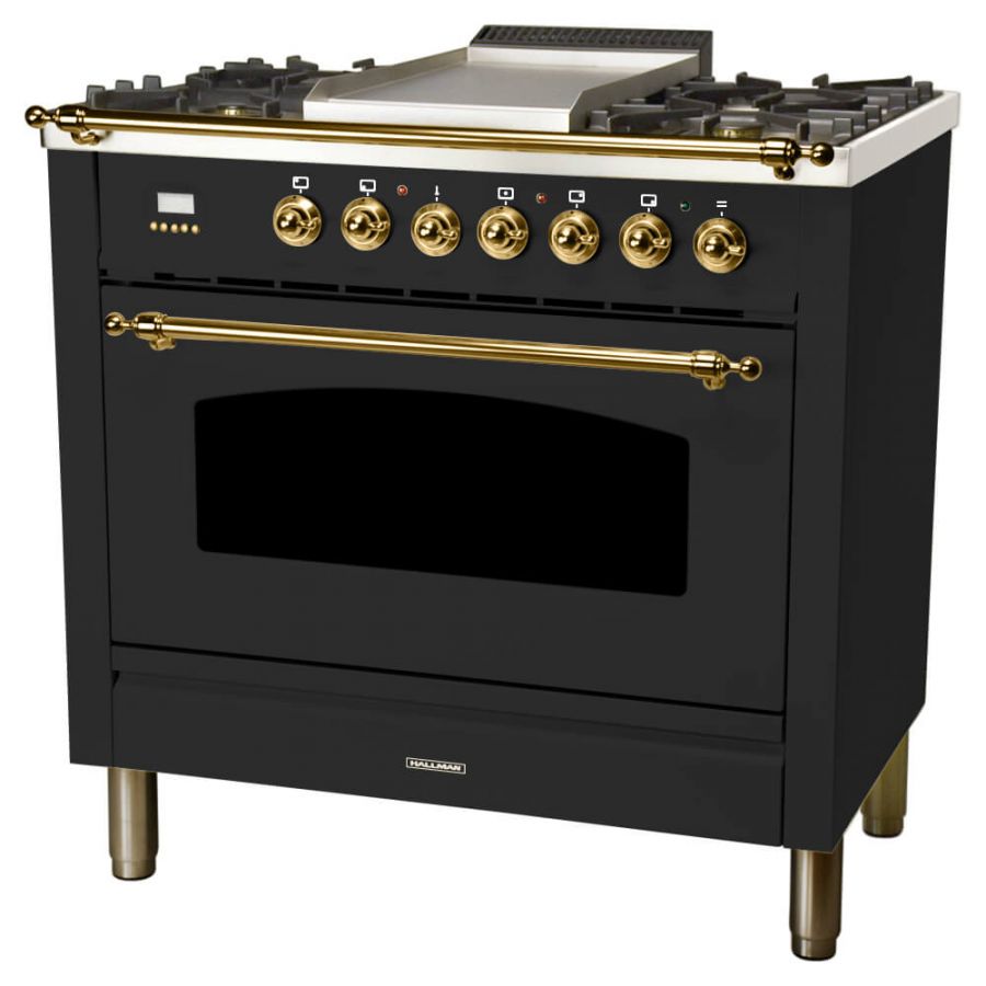 HALLMAN Professional Ranges marry elegant design with impeccable cooking performance. The sealed Italian brass burners provide a perfect blend of power and precision, with output ranging from 15,500 BTU, down to 1260 BTU. The removable stainless steel griddle features an oversized brass oval burner with 10,500 BTU. A grate is also provided to place over the oval burner, creating flexible functionality. Heavy-duty cast-iron grates provide a single continuous cooking surface, making it easy and safe to maneuver cookware from one burner to another.