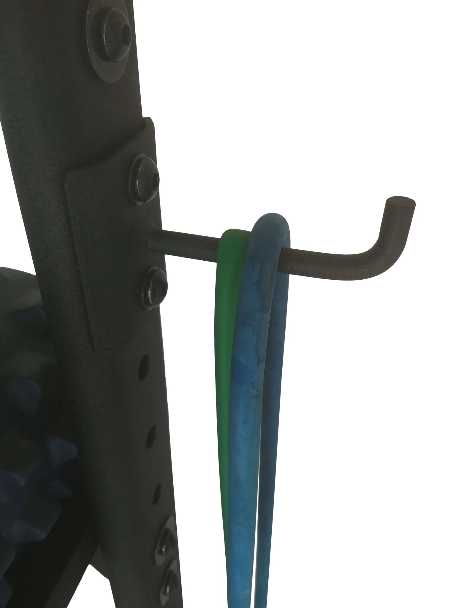 The HUB250 provides a large amount of storage in a compact 25” wide footprint. Designed to replace multiple single-product racks, it can be configured to store a wide range of accessories. Adjustable shelves fit various equipment, while four uprights allow plenty of room for accessory attachments. Add landmine and/or battle rope attachments to create a functional training system. Perfect for home gyms, personal training, and small group training. Stores accessories efficiently.