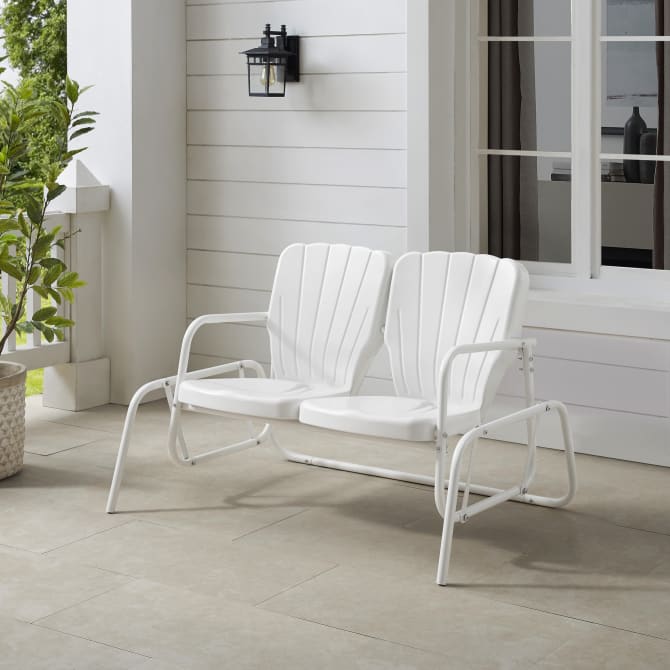 Inspired by the designs of yesteryear, the Ridgeland Loveseat Glider brings class and charm to your outdoor space. The loveseat features a vintage-inspired clamshell back with decorative grooves perched atop a smooth gliding base for stylish comfort. Made of durable steel, this glider has a powder-coated finish that resists rust and sun fade. The Ridgeland Loveseat Glider is ideal for adding a dash of retro cool to your porch or patio.