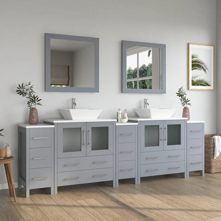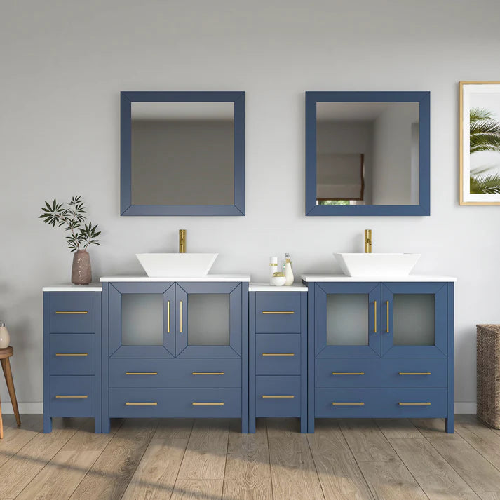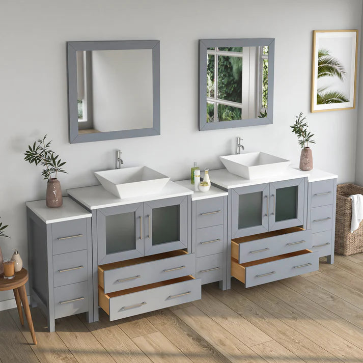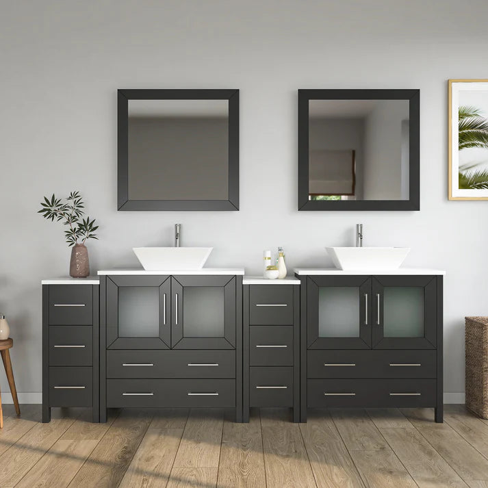 84 inch double sink bathroom vanity set with ceramic vanity top with soft closing doors and drawers. Includes sinks and mirrors. Faucets sold seperately.