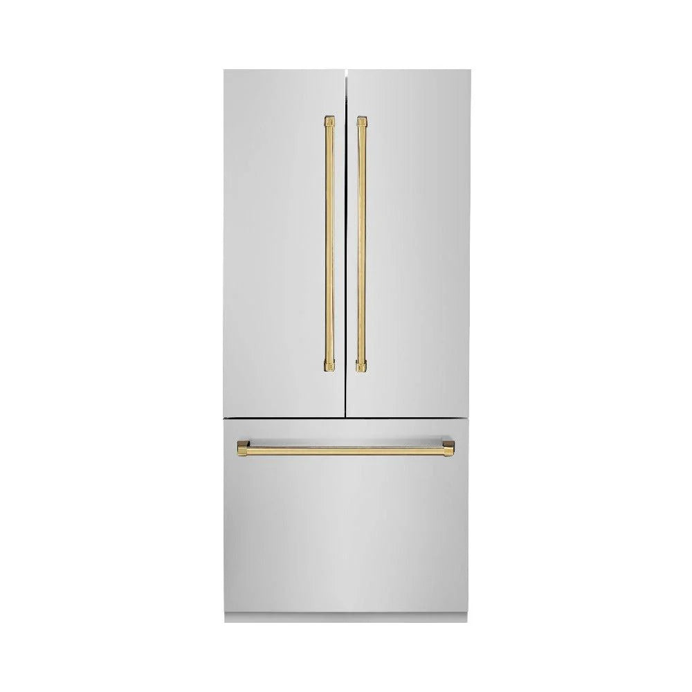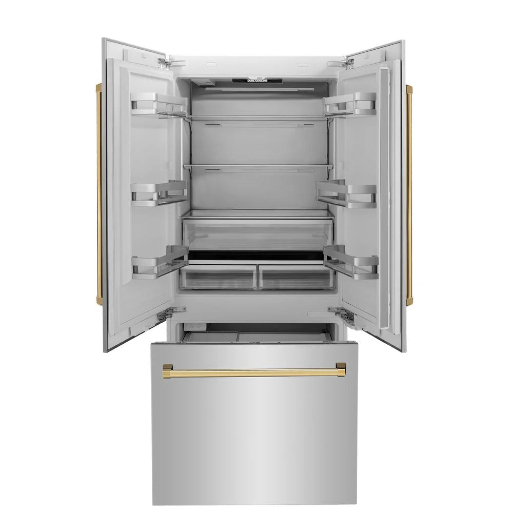 The ZLINE Autograph Edition 36 in. 19.6 cu. ft. French Door Built-In Bottom Freezer Refrigerator with Water Dispenser and Ice Maker provides the ultimate upgrade to the center of your home by pairing premium dual cooling technology with enhanced storage capacity for multiple grocery items. Achieve ZLINE Attainable Luxury® excellence with innovative features designed to enhance your kitchen’s cooling and freezing capability.